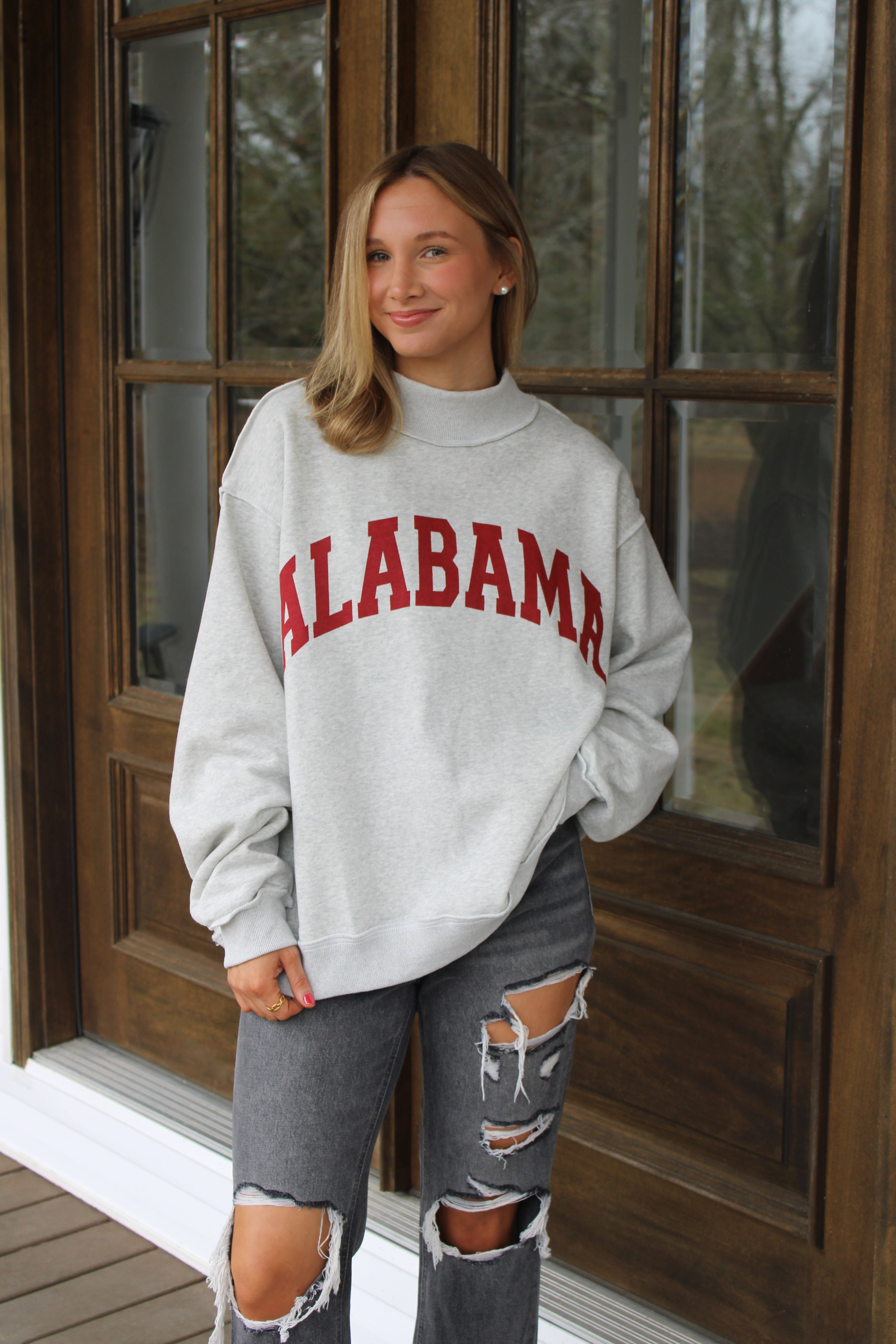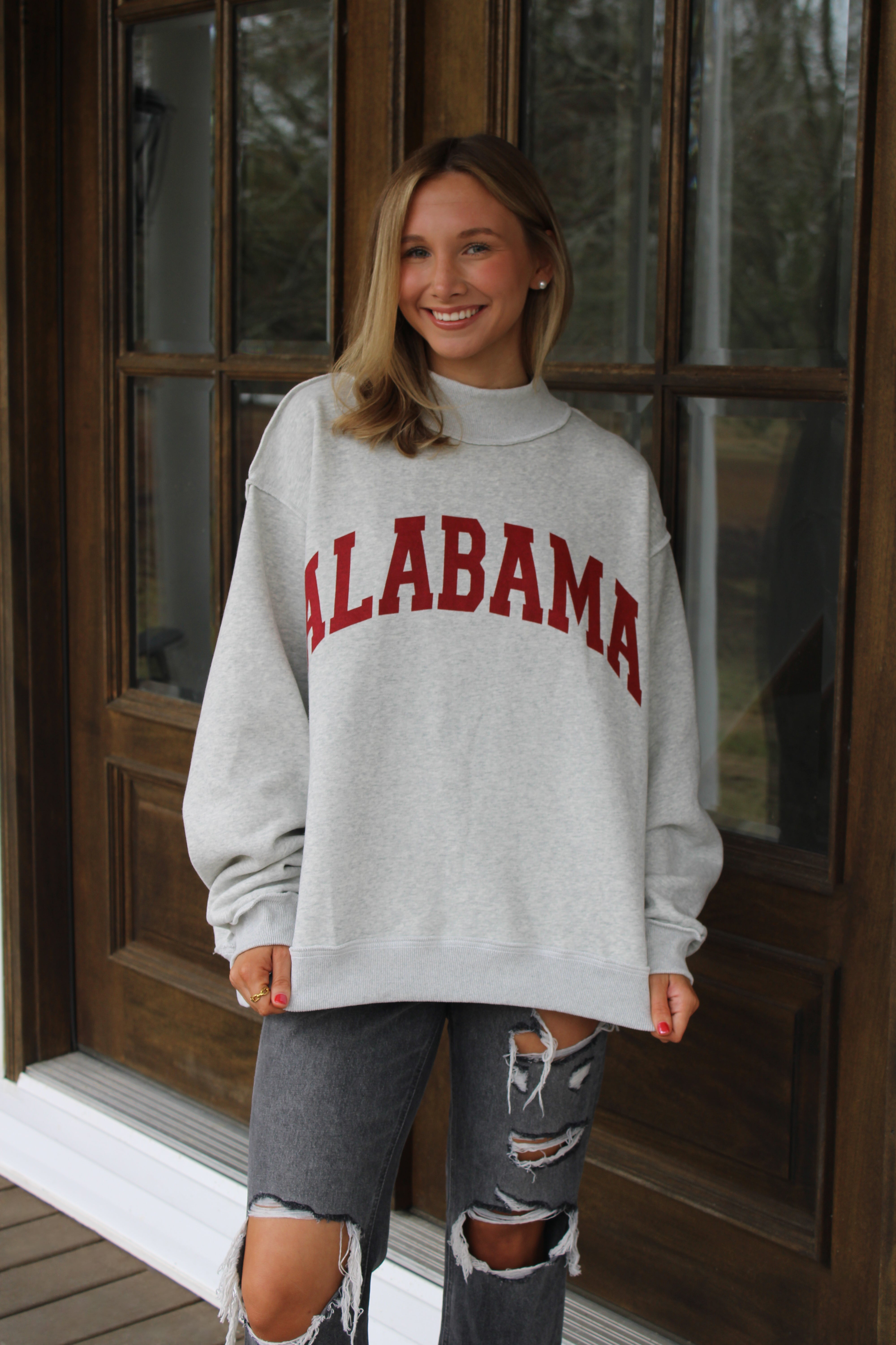 - Elevate your casual wardrobe with this versatile reversible sweatshirt, featuring a striking ALABAMA print on one side and AL on the other. Crafted from the softest cozy fleece, it delivers exceptional comfort for everyday wear. The mock-neck design pairs seamlessly with drop shoulders and extended sleeves for a relaxed, contemporary silhouette. An oversized fit ensures effortless layering, while reinforced rib banding at the hemline and cuffs maintains structure and durability. The reversible construction lets you alternate between two distinct looks, maximizing style options from a single piece. Perfect for a comfy gameday look.